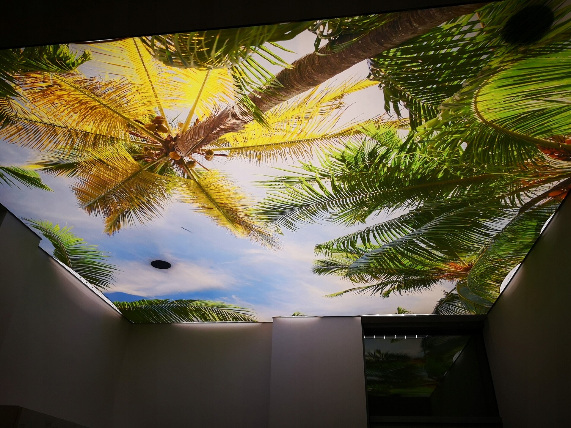 Нужно было сделать натяжной потолок в кафе за 1 день. Монтаж уровневого потолка 84 м2 занял 16 часов. За верхним уровнем расположена диодная подсветка. При включении создаётся эффект солнечного летнего дня